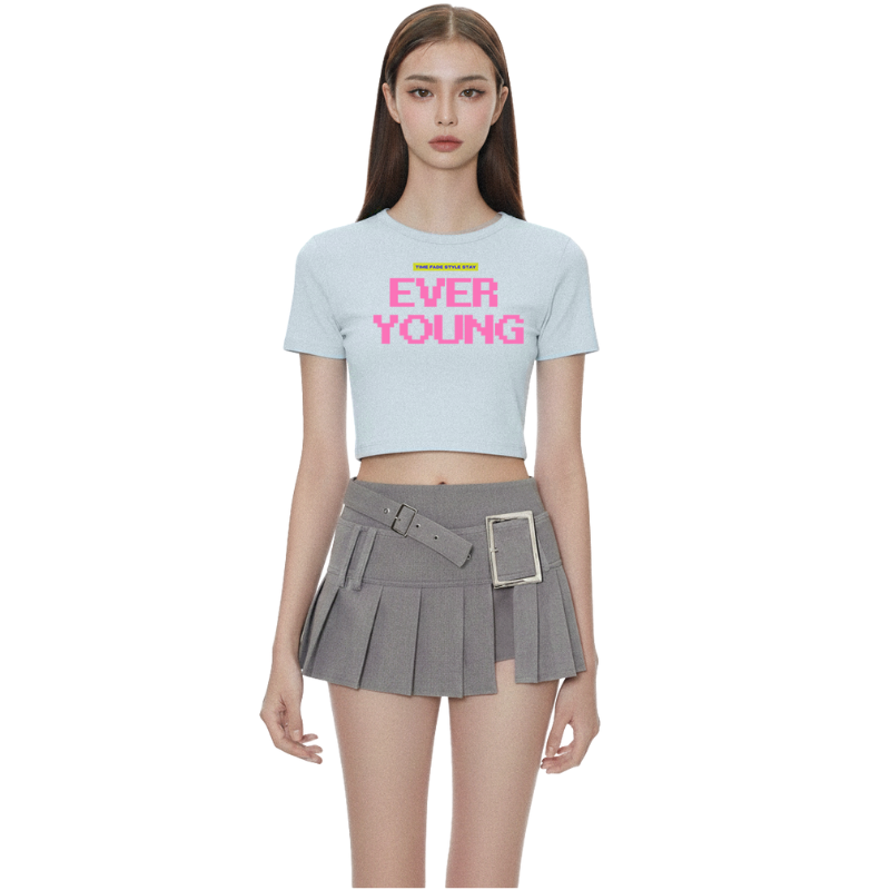 เสื้อยืดครอปแขนสั้น พิมพ์ลายกราฟิกตัวอักษร “EVER YOUNG” สไตล์ Y2K มีสองโทนสีคือ ฟ้าอ่อน และชมพู