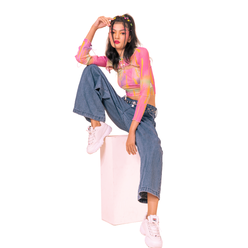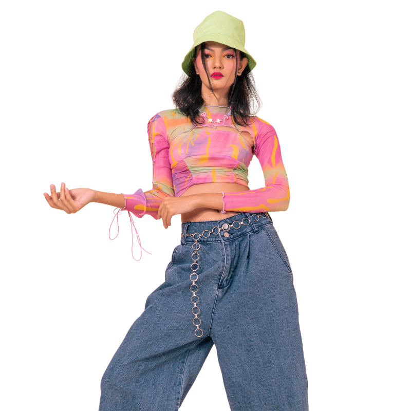 เสื้อซีทรูคอกลมแขนยาว ลาย Abstract มัดย้อม สีชมพู-ส้ม-เหลือง เพิ่มลูกเล่นด้วยเชือกผูกรูดบริเวณแขนเสื้อและปลายแขน (Drawstring details) เนื้อผ้า ผ้าตาข่าย (Mesh) เนื้อละเอียด ยืดหยุ่นสูง ใส่แล้วไม่คัน มาคู่กับสายเดี่ยวตัวในสีเข้าชุด