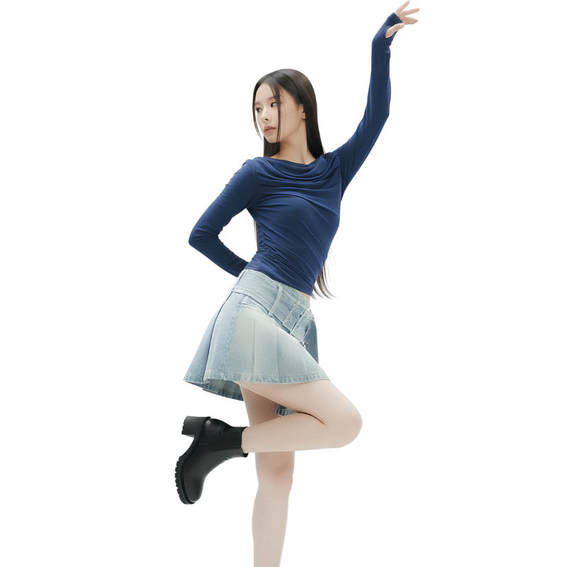เสื้อแขนยาวสีน้ำเงินเข้มดีไซน์คอถ่วง (Draped) เนื้อผ้าทิ้งตัว สวมคู่กับกระโปรงยีนส์จีบสีฟ้าอ่อน